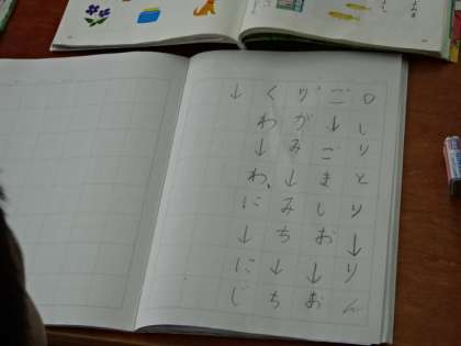 ひらがなの学習を終えた1年生。平仮名を使ってしりとり遊びです。しりとりがたくさん続くように考えます。2ページにわたって,しりとりがつながる子もいました。楽しく学習しています。