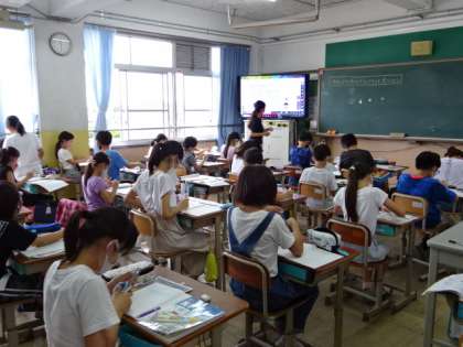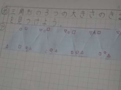 今日は三角形の3つの角の決まりについて調べました。実際に三角形を切ったり並べたりして調べていきました。