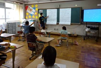 歌をみんなで歌います。先生も一緒になって,みんなで楽しく歌っています。思わず立ち上がり,体でリズムをとる子もいます。