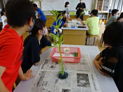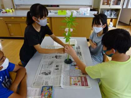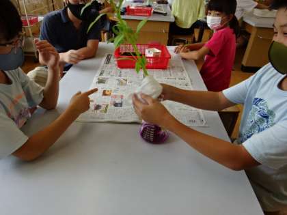 ホウセンカを使って,植物は根から吸い上げられた水がどのように全体に行きわたるのかを調べます。今日は実験のための準備をみんなでしました。