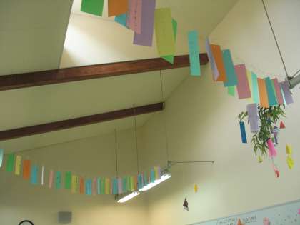 7月からは七夕仕様となり,サービスホールの天井には6年生の「卒業までに食べたい献立」の短冊と調理員さん手作りの七夕飾りが揺れています。