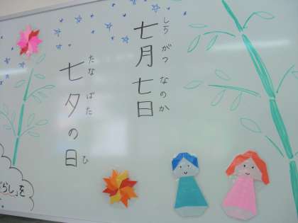 また入口正面には,これまた調理員さんの力作である「織姫」と「彦星」が子どもたちを見守っています。