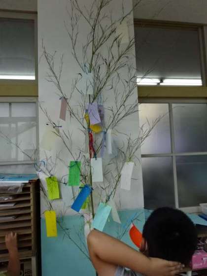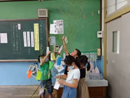 地域の方からいただいた笹を使って,2年生も七夕飾りです。「コロナが早くおさまりますように。」という願い事もありました。みんな願うところは同じですね。