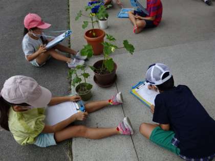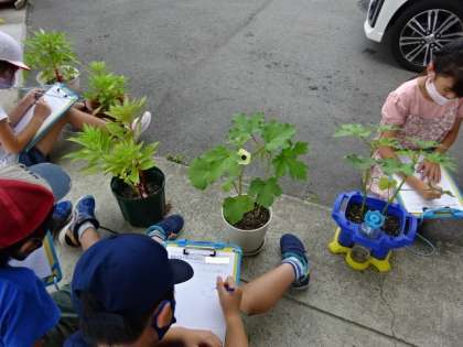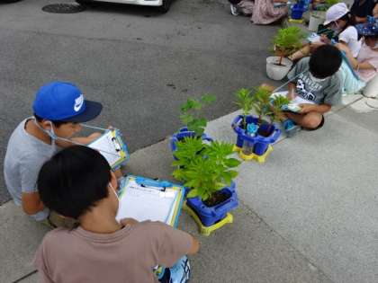 ホウセンカ,オクラを観察している3年生。オクラは実をつけ始めています。大きく育っています。