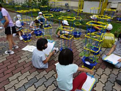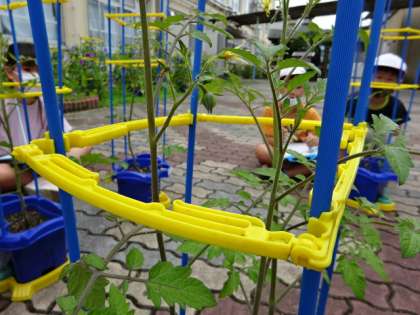 2年生はミニトマトの観察です。花が咲き始めているようで,嬉しそうに教えてくれました。実を付けるまでもう少しですね。