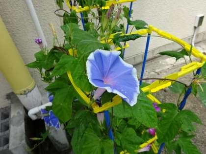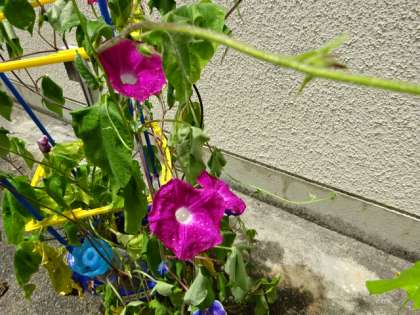 1年生が大切に育てているアサガオがたくさんの花をつけています。いろいろな色できれいに咲いています。夏休みはお家で育てます。しっかりお水をあげて,引き続き大切に育ててくださいね。