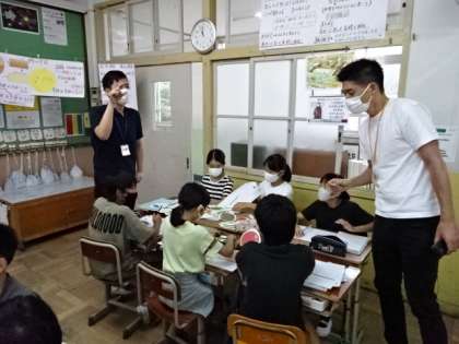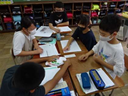 6年生と一緒に家庭科の学習をしました。2学期に予定している調理実習に向けて,必要な栄養バランスについて考えながら,朝食メニューをグループで考えました。「朝から体温を高めるために味噌汁を飲む。」や「緑色の食材を手軽に食べられるようにする。」等,たくさんの意見が出ていました。