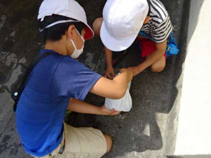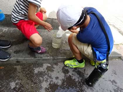 「かさ」の学習です。1リットルがどれぐらいかを,みんなで調べ体感しています。自分たちの水筒にもどれぐらいの量のお茶が入っているのか,見当がつき始めている子もいるようです。