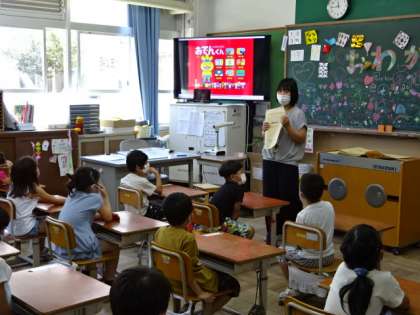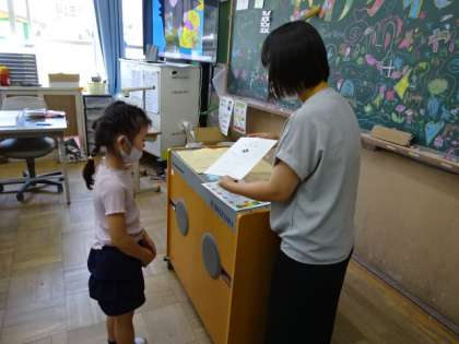 1年生にとっては初めての通知票。担任の先生から一人一人に手渡されました。1学期頑張れたことを先生と一緒に確認しました。