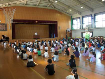 今日で1学期が終了です。今年もコロナ禍ということで,これまで各教室とオンラインで朝会などを実施してきましたが,今日の終業式では,2年生と6年生が体育館に集まり,その他のクラスは教室でオンラインの形で実施しました。