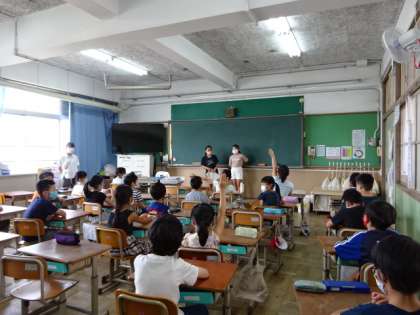 3年生の朝の会での様子です。日直のスピーチは,「夏休みの出来事」をテーマにして,順番にスピーチしています。それぞれがどんな夏休みを過ごしたのか,みんな興味津々で聞いています。