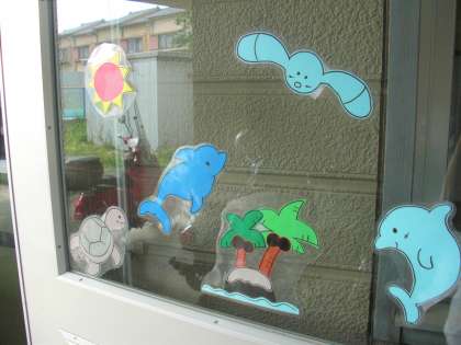 給食室も2学期の開始に合わせ,調理員さんが素敵な飾りを用意してくださりました。特にサービスホールの入り口ではかわいいイルカさんたちがお迎えしてくれます。