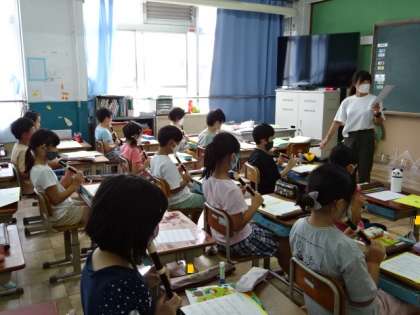 緊急事態宣言発出中はリコーダー演奏ができないので,教室で指の動かし方をみんなで確認しました。家での練習では,タンギングに気を付けながら,美しい音色で演奏できることを目指したいです。