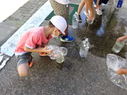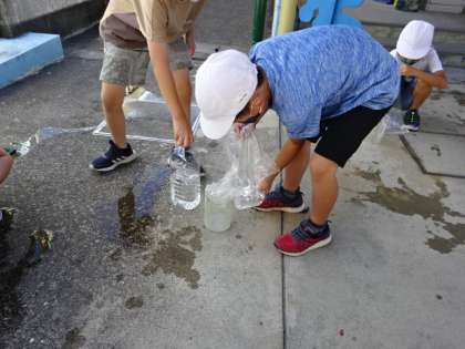 「かさ」の学習です。今日は1リットルマスを使って,1リットルの水のかさはどれぐらいなのか,体感しました。2リットルのペットボトルを使ったり,大きなビニル袋を使ったりして,思い思いに1リットルを量っていました。