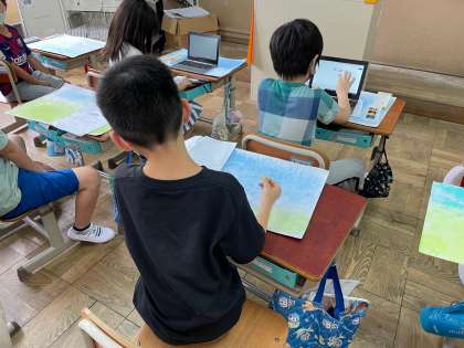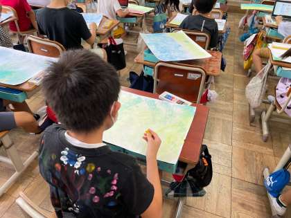 図画工作科では「おはなしを絵にあらわそう」という学習をすすめています。お話を聞いてお気に入りの場面を描いていきます。絵の具を使って背景をつくり,下描きを進めています。どんな作品ができるのか楽しみです。