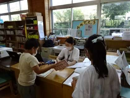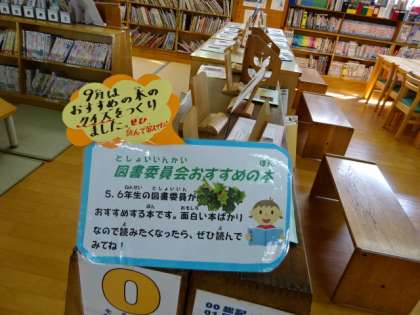 図書館での読書活動。みんないつもお気に入りの本を借りて,読書を進めています。図書委員が選ぶお勧めの本は,いつもすぐに貸し出し状態になります。