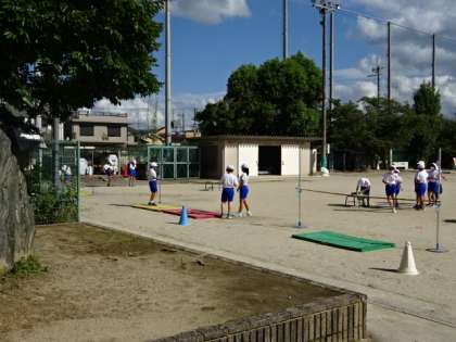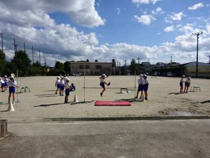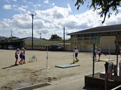 「たかとび」に挑戦しています。目標とする高さをクリアできると,みんなで拍手をおくるグループもありました。みんなで声を掛け合いながら頑張っています。