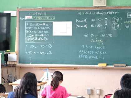 「比とその利用」の学習です。6年生で学習することは,小学校での算数の集大成であると共に,中学校の数学に向けての準備でもあります。集中して学習に取り組んでいます。