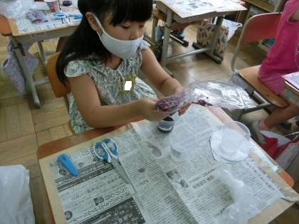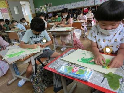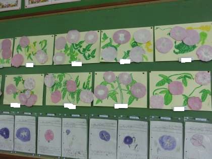 朝顔の花で色水遊びをしました。朝顔の花で色水を作り,半紙に浸すと様々な模様ができました。丸く切った半紙ですると,朝顔の花のように!画用紙に朝顔の葉やくきをよく見て描き,素敵な作品ができました。