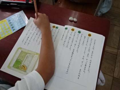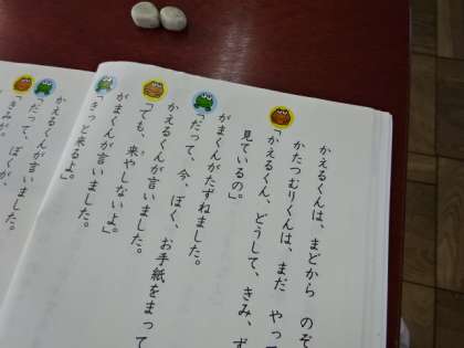 「お手紙」を読み進めています。がまくんとかえるくんのやり取りが分かるように,それぞれが話している文にシールを貼りました。