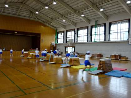 「とび箱運動」の学習です。台上前転やかかえこみ跳びにも挑戦しています。自分たちが安心して跳べるように場も作り変えて,力いっぱい挑戦しています。