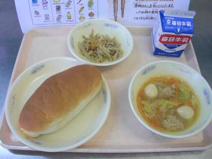 ミルクコッペパン 牛乳 肉だんごのスープ煮 ごぼうのソテーです。