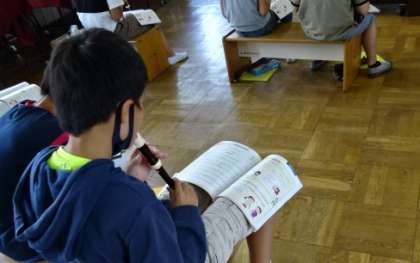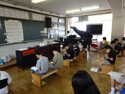 音楽の時間,リコーダー演奏に取り組んでいます。学校の教室では久しぶりの演奏です。
