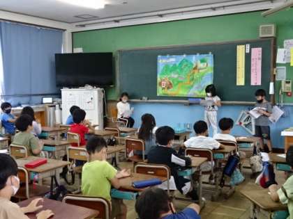 「お手紙」を学習してきた2年生。今日はまとめの学習で音読発表会です。お手紙のお話場面を描いた地図の前で,役割に分かれて音読発表しました。
