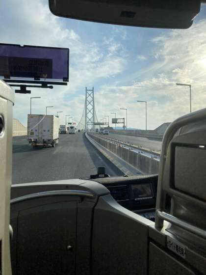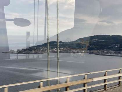 姫路城を出発して,宿舎を目指しています。明石海峡大橋を渡り,淡路島が見えてきました。