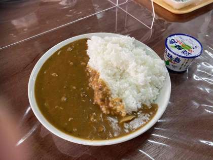 昼食は,ビーフカレーライスとヨーグルトです。ビーフカレーライスは,量を自分で選びます。自分が食べられる量を考えて注文していました。