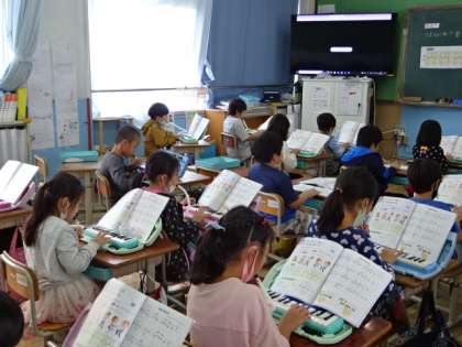 鍵盤ハーモニカやタンバリンなどの複数の楽器を使って演奏を楽しみました。