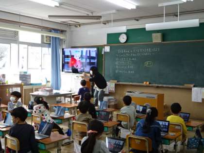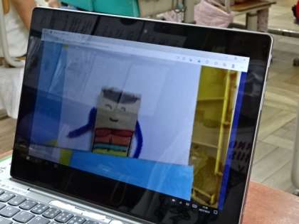 「すきまちゃんのすきなすきまを見つけよう」の学習です。今日はそれぞれが作った「すきまちゃん」をいろいろなところに置き,タブレット端末で写真撮影し,みんなで「すきまちゃん」がどこにいるのかを写真を通して交流しました。思わないところから「すきまちゃん」が登場するので,みんなで楽しんでいました。