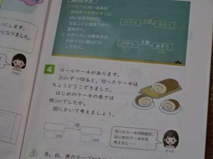 「何倍でしょう」の学習です。問題文を関係図に表して考えています。たくさん問題を解いていくうちに,関係図もスムーズに書くことができるようになってきました。