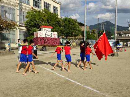 「キャッスルリレー 心かさねて」では,各クラスで作成した神輿を持って入場です。