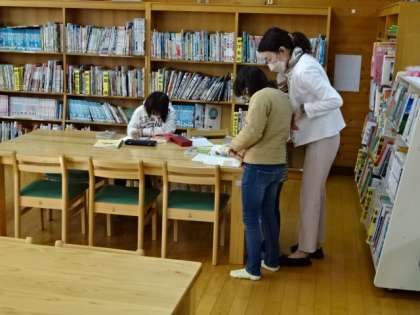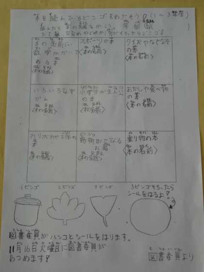 図書館の時間の様子です。今日は,図書委員会が企画した図書ビンゴに挑戦です。学校司書の先生にもヒントをもらいながら取り組んでいます。