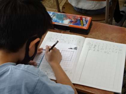 「三角形と四角形」の学習です。定規を使い,方眼のマスに直角三角形や長方形などの図形を描く練習をしました。