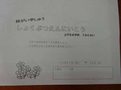 11月11日(木)に校外学習で植物園に出かける1年生。今日は,しおりを見ながらどのような学習になるかを確かめました。お弁当を持っての校外での活動を,みんな心待ちにしています。体調をしっかり整えて,みんなで元気に参加できるといいですね。お天気になりますように。