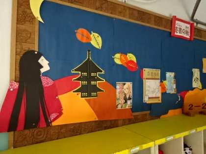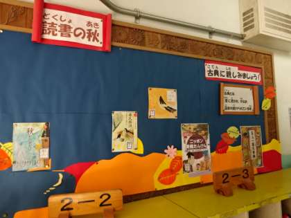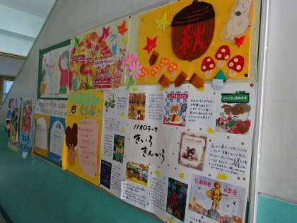 読書の秋です。図書館前の掲示板も模様がえです。これからも,たくさんの本を読んでいきたいですね。