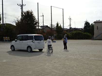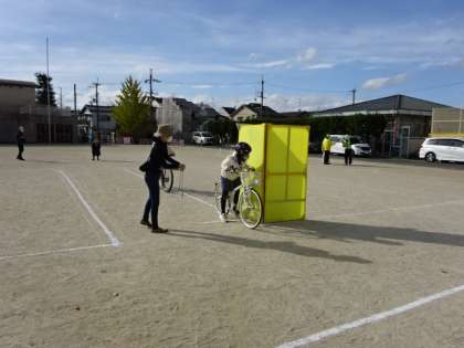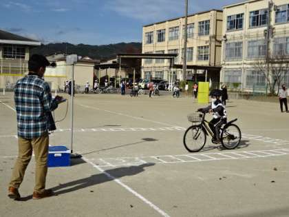 まずは,北警察署の方の説明や,自転車に乗る際の注意やポイントを見本で見せていただいた後,実際に検定コースに出ていきました。