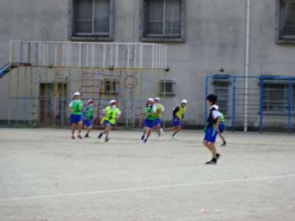 タグラグビーをしています。チームごとに色の違ったビブスを付けて,腰にはタグをつけてゲームをしています。チームでパスをつなぎながら,トライを目指しています。