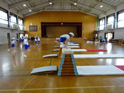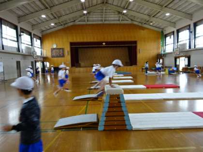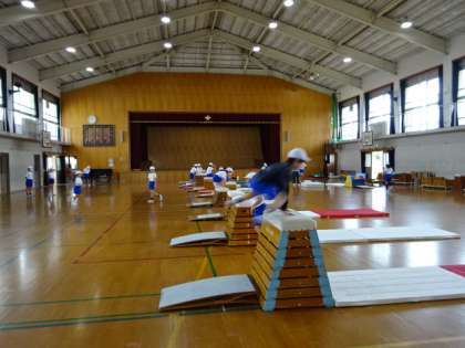 3年生のとびばこの学習の様子です。高い段にも果敢に挑戦しています。また,開脚跳びだけでなく,かかえこみ跳びにも挑戦しています。