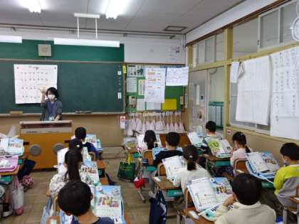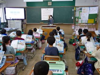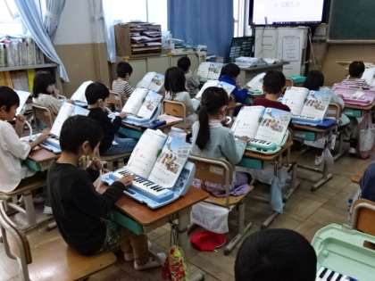 1年生の音楽の時間の様子です。先生の伴奏に合わせて,鍵盤ハーモニカで演奏です。