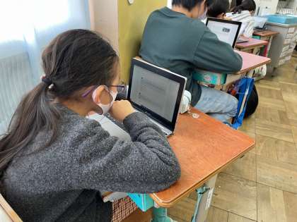 ジュニア京都検定に挑戦です。今年は,各自タブレット端末で答えます。タブレット端末で回答を送信し,その場で答え合わせもできるので,子どもたちも興味深そうに取り組んでいました。