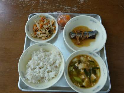 今日の給食は,「麦ごはん・さんまのしょうが煮・根菜のごまいため・九条ねぎのみそ汁・柿」でした。和献立の日でした。さんまは,骨まで柔らかく,味がしみていて,おいしくいただきました。