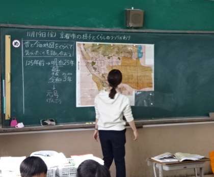 上賀茂地域の今と昔のちがいを,昔の地図を見ながら調べています。地域の方をゲストティーチャーに迎え,昔の上賀茂地域の様子も教えていただきます。みんな興味をもって,自分たちの住む町について調べています。