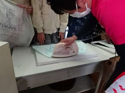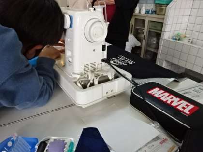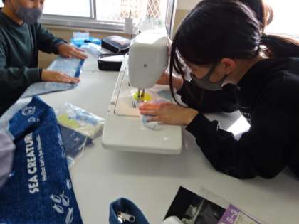 エプロンを作成していきます。思い思いの絵柄を選んで,ミシンを使って作成していきます。いいものに仕上がるよう,手順を先生と確認しながら作成を進めています。
