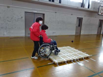 上賀茂社会福祉協議会の方々にお世話になり,車いす体験教室がありました。車いすに乗る立場,そして,車いすを押す立場をそれぞれ体験しました。