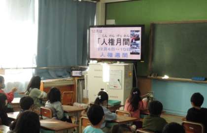 12月の朝会は,人権朝会です。今回,体育館には3年生と4年生が集まり,その他の学年は各教室でオンラインを通して朝会に参加しました。