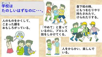 学校は楽しいところですが,本当に上賀茂小学校のみんなが毎日の学校生活を楽しく過ごすことができているのか。全校のみんなに日々の生活を振り返ってもらうために,スライドをを使って話をしました。