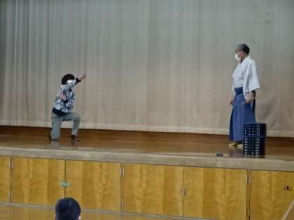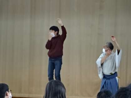 何名かは実際に舞台に立って,稽古をつけていただきました。アドバイスをしていただき,みんな動きが狂言の動きになっていきました。